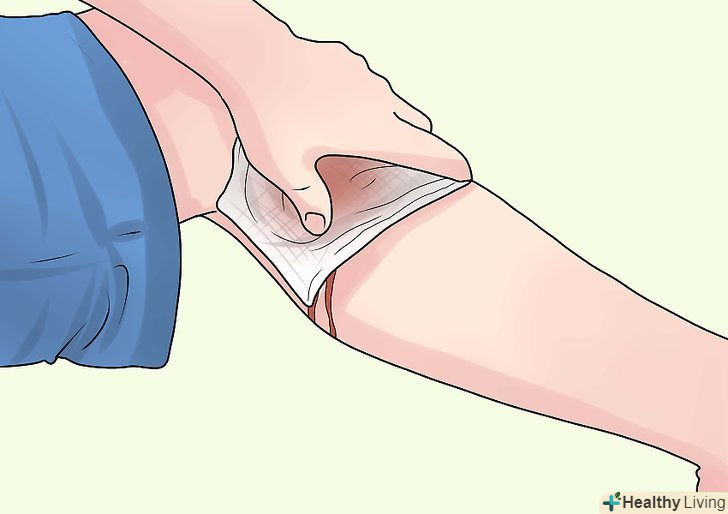 Знайдіть точку тиску на артерію між раною і серцем: це означає, що необхідно знайти артерію (або артерії) і натиснути на неї навпроти кістки. Якщо марлева серветка, щільно притиснута до рани вашою рукою в Протягом 5 хвилин, зупиняє кровотечу, тоді знайдіть спосіб підтримувати певний тиск і не переміщайте людини. Подивіться, чи просочується кров через марлеву серветку, але Не прибирайте руку, щоб покласти ще одну серветку поверх інших, поки принаймні не пройде Хвилин 5 .- Клацніть по картинці нижче, щоб дізнатися, де знаходяться точки притиснення артерій: