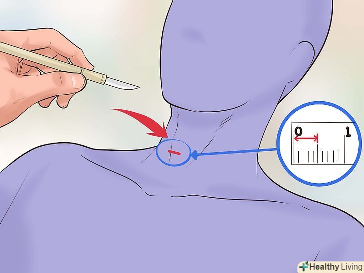 Виконайте горизонтальний розріз довжиною і глибиною 1,5 см. після виконання розрізу, ви побачите перстнещитовидную зв'язку (це Біла еластична мембрана, яка розташовується між двома хрящами). [7] виконайте розріз в цій мембрані досить глибоко, щоб відновити потік повітря.- Враховуючи екстрений характер даної процедури, не витрачайте час на стерилізацію. Час має більше значення, ніж потенційний ризик можливої інфекції. [8]