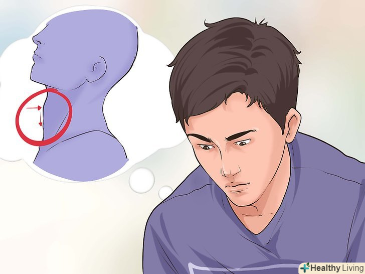 На шиї у потерпілого необхідно знайти область над перстнещитовидной зв'язкою. це м'яке місце на горлі, де необхідно виконати розріз.- Щоб знайти місце розрізу, спочатку знайдіть щитовидний хрящ (адамове яблуко). У дорослих чоловіків знайти адамове яблуко не складає труднощів. Щоб визначити щитовидний хрящ у жінок і дітей необхідно буде пропальпувати шию.