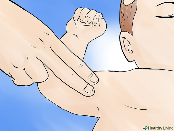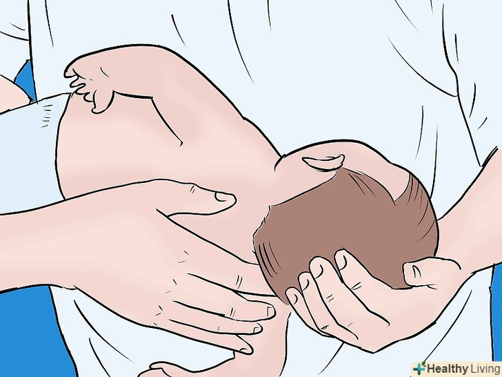Кількома пальцями натисніть на грудну клітку 30 разів.З'єднайте разом два або три пальці і поставте їх на середину грудної клітини немовляти нижче рівня сосків. Акуратно, плавно натисніть на груди 30 разів.- * Якщо ваші пальці втомилися, і Вам потрібно посилити натиск, ви можете допомогти другою рукою. В іншому випадку ваша друга рука повинна притримувати голову немовляти.