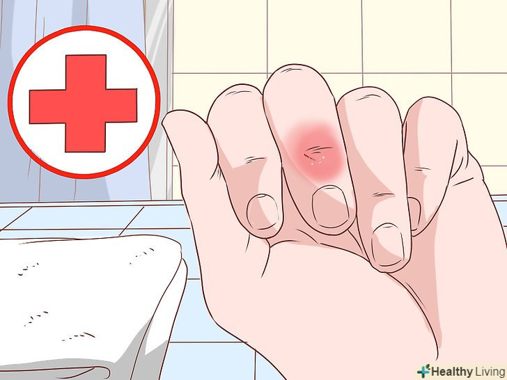 Зупиніть кровотечу. якщо скалка викликала кровотечу, то зупиніть його шляхом прикладання тиску. [15] так ви захистите себе від значної крововтрати і шоку. [16] якщо рана маленька, кров перестане текти через кілька хвилин. Якщо ж кровотеча сильна, або кров не зупиняється, не відкладаючи зверніться за медичною допомогою.- Перемотайте рану бинтом або марлею.