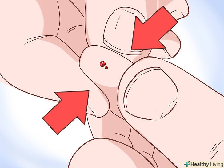 Обережно стисніть ранку. після успішного вилучення скалки обережно стисніть ранку, щоб вийшла крапля крові. Так ви промиєте ранку від мікробів. [14]- Не стискайте занадто сильно. Якщо ранка не кровоточить, то можна використовувати інші способи видалення мікробів і бактерій, включаючи бактерицидну мазь.