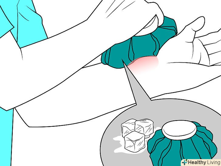 Прикладіть до зап'ястя лід. холодний компрес ефективно діє на травмоване зап'ястя, тому що холод швидко поширюється через шкіру в глибокі тканини. [34]- Холод сприяє зменшенню припливу крові до травмованої області і зводить до мінімуму набряк, зменшує запалення. [35]