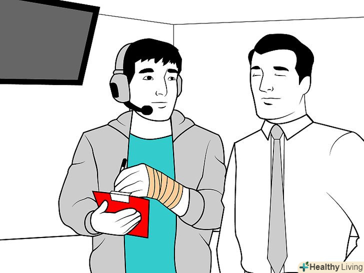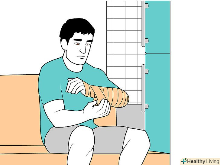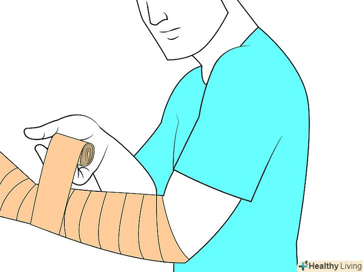 Перев'яжіть зап'ястя. тиск допомагає зменшити набряк і гіперемію (зміна кольору), а також пов'язка дозволить запобігти зайві рухи в суглобі, які можуть бути болючими. [38]- За допомогою еластичного бинта накладіть пов'язку на зап'ясті, почніть з пальців і долоні, рухайтеся у напрямку до ліктя. Щоб травмоване зап'ястя було добре зафіксовано і швидше зажило, потрібно бинтувати від пальців до ліктя. [39]