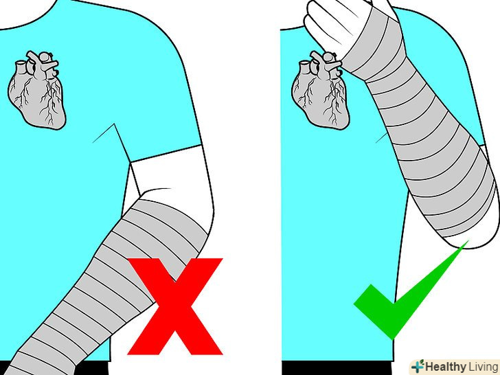 Закріпіть еластичний бинт. ви можете зафіксувати його за допомогою липучок або спеціальних гачків з петлями, або ви можете зробити кріплення самостійно. Можна просто зафіксувати вільний кінець між шарами бинта на передпліччі. [10]- Помацайте пальці рук - вони повинні бути теплими. Це означає, Ви забинтували не надто туго. Пальці повинні вільно ворушитися, не повинно бути оніміння і надмірного тиску пов'язки. Пов'язка повинна бути щільною, але не настільки, щоб перекрити приплив крові до пальців. [11]