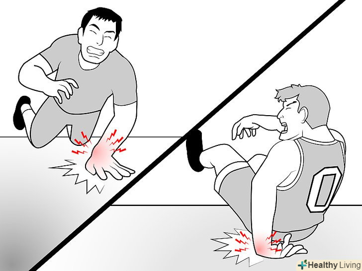 Постарайтеся запобігти надмірному розтягуванню зап'ястя при заняттях спортом. для цього накладіть пов'язку, щоб уникнути спортивних травм. Найчастіше це робиться, щоб запобігти розтягуванню і переразгибания. [52]- Розтягнення - найбільш поширений вид травми зап'ястя. Розтягнення найчастіше відбувається тоді, коли ви інстинктивно при падінні витягаєте руки і невдало на них приземляєтеся. [53]