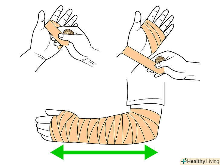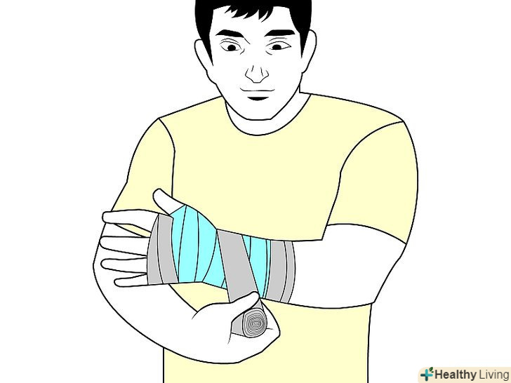 - Продовжуйте замотувати зап'ясті, рухайтеся в бік ліктя, кожен новий шар бинта повинен покривати 50% попереднього шару. [19]