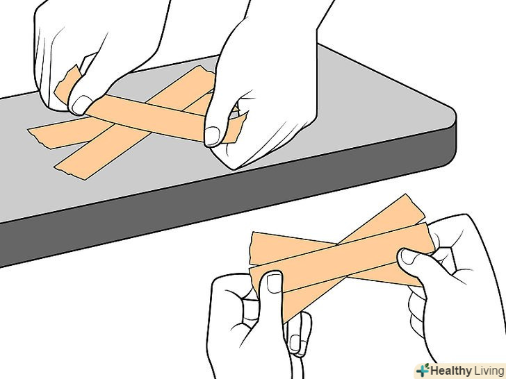 - Помістіть шматок пов'язки (стрічки) на чисту рівну поверхню. Слідом за цим шматком пов'язки покладіть ще один шматочок такої ж довжини, вони повинні перетинатися в центрі під невеликим кутом. [71]