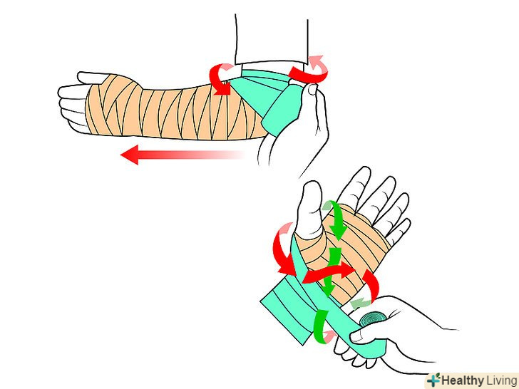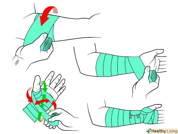 Почніть забинтовувати зап'ясті з долоні. спочатку оберніть пальці трохи нижче кісточок, потім забинтуйте долоню. [4]- Обгортаючи між великим і вказівним пальцем, кілька шарів бинта накладіть на область зап'ястя, потім продовжуйте обгортати у напрямку до ліктя. [5]