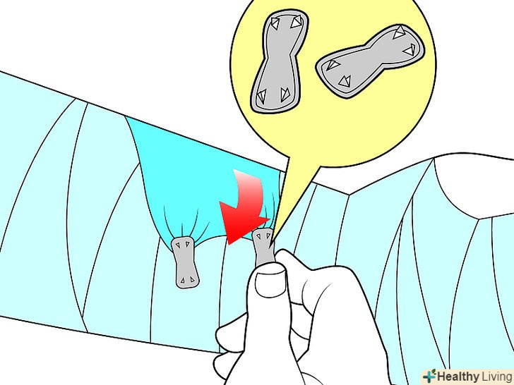 Зафіксуйте прокладку. якщо Ви користуєтеся стандартною медичної або атлетичної пов'язкою (1,5-2,5 см), обв'яжіть вільні кінці навколо передпліччя і зав'яжіть, щоб прокладка трималася на місці, або зафіксуйте за допомогою спеціальних затискачів або гачків з петлями. [62]- Залиште кінці стрічки вільними (кілька сантиметрів), щоб їх можна було зав'язати навколо зап'ястя і зафіксувати пов'язку. [63]