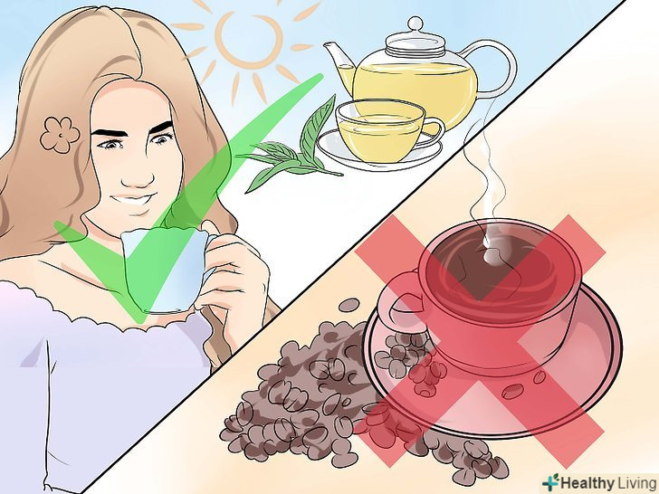 Подумайте про те, скільки кофеїну ви споживаєте.у деяких сортах чаю міститься кофеїн (звичайно, не в такій кількості, як в каві), але якщо ви п'єте чай добу безперервно, то кількість кофеїну набереться достатня! Строго кажучи, кофеїн не викликає зневоднення, але в одній чашці його вміст становить приблизно 50 мг.якщо ви можете цього уникнути, краще не перевищуйте 300 мг в день.[8]- Ви можете або зменшити час заварювання чаю (тим самим не дозволяючи занадто великій кількості кофеїну розчинитися в чаї), або пити трав'яні чаї, що не містять кофеїн. Хоча для більшості людей це не представляє проблеми, Деякі люди можуть проявляти підвищену чутливість до кофеїну і високий рівень кофеїну може стати для них результатом безсоння, нервозності та інших симптомів навіть через багато годин.[8]