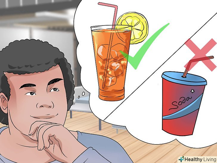 На обід і вечерю вибирайте холодний чай (без додавання цукру) замість газованих напоїв.відомо, що підсолоджені і навіть дієтичні газовані напої мають протилежний втрати ваги ефект.Натрій, що міститься в дієтичних газованих напоях, може сприяти утриманню води, тому краще робіть розумний вибір: чай з льодом без цукру. Холодний чай також ідеально підходить тим, хто хоче напій з кофеїном, щоб залишатися бадьорим протягом дня, так як холодний (або гарячий) чай допоможе вам досягти цього результату і при цьому він не містить цукор як звичайний газований напій або натрій як дієтичний газований напій.- Одна з найважливіших складових ефекту, який чиниться чаєм на схуднення полягає в тому, що чай не містить домішок. Чай містить мало калорій (якщо все робити правильно) і буде стримувати вас від поїдання інших, більш калорійних продуктів. Тут працює той же принцип, що і в разі схуднення за допомогою води.