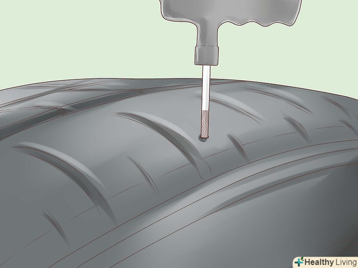 Візьміть ремонтний джгут і умочіть його в цементуючу речовину (і те і інше ви знайдете в наборі).використовуйте спеціальний інструмент, щоб заштовхати джгут в прокол. Приблизно 1,5 см джгута повинні залишатися зовні.