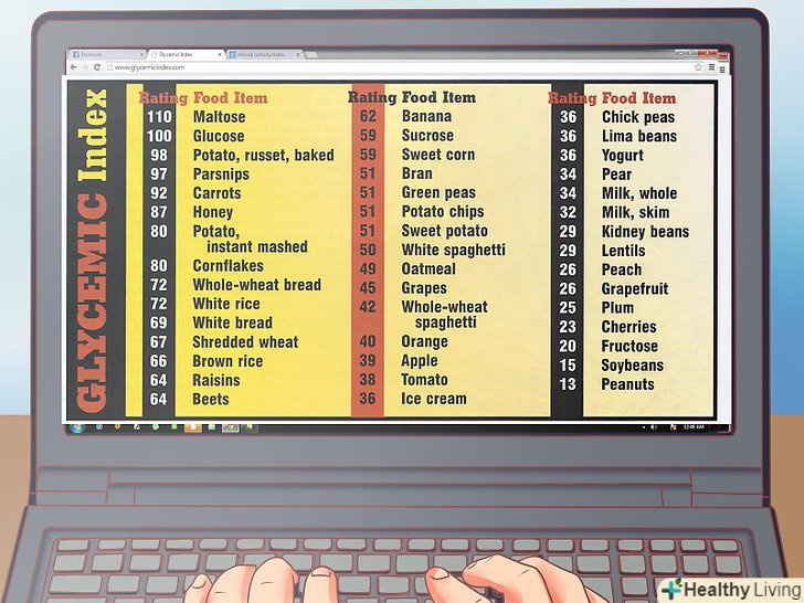 Зверніть увагу на продукти, які викликають у вас сумніви.якщо ви не впевнені в користі певного продукту, проконсультуйтеся з лікарем. Крім того, ви можете знайти в Інтернеті список продуктів з низьким глікемічним індексом. [6] продуктів з високим глікемічним індексом, вище 70 одиниць, слід уникати, якщо у вас високий рівень цукру в крові. Замініть їх продуктами з низьким глікемічним індексом (нижче 55 одиниць). [7][8] продукти з індексом між 55 і 70 мають середній глікемічний індекс.