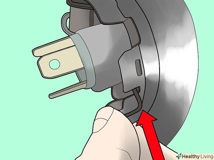 Застебніть дротяний фіксатор назад під гак.це може виявитися досить складним заняттям, особливо на пасажирській фарі, де корпус автомобіля блокує Вам вид. Порада: це можна виконати однією рукою, тримаючи лампочку спереду і фіксатор за нею. Потім просто зафіксуйте дротяний фіксатор під гак.