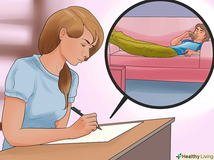 Вивчіть свій щоденник харчування, звернувши увагу на певні закономірності.записуючи в щоденник такі подробиці, як свій настрій і навколишнє оточення, Ви зможете виявити деякі закономірності і виявити фактори, що призводять до переїдання.[33] наприклад, ви можете помітити, що часто переїдаєте, коли відчуваєте стрес і чимось засмучені, або коли гостюєте у батьків, або після спілкування з певними людьми. Це явище носить назву стресового, або емоційного переїдання.- Слід також звернути увагу на такі фактори, як занадто довгі перерви між прийомами їжі (що призводить до переїдання, коли ви нарештідобираєтеся до їжі), Їжа на ходу (наприклад, в машині або при занятті іншими речами), перед телевізором або комп'ютером (люди з'їдають більше, коли їх що-небудь відволікає від прийому їжі).[34]