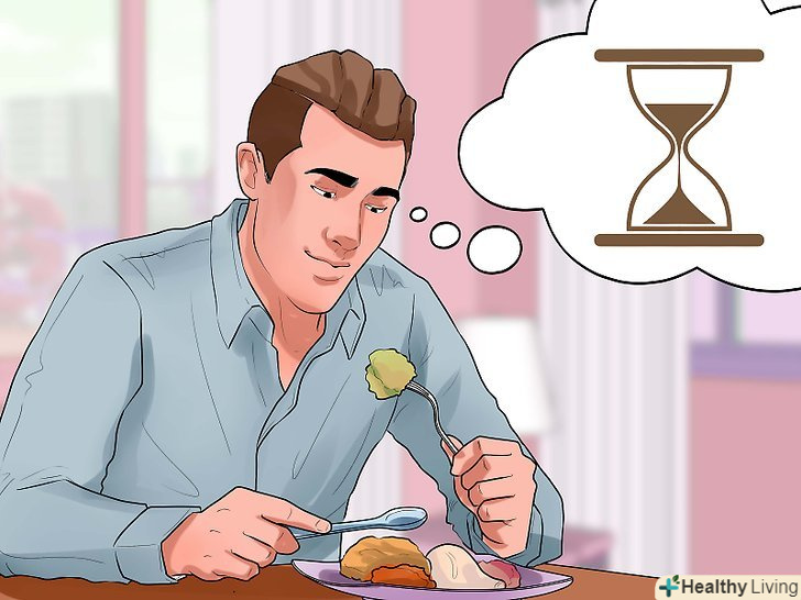 Їжте не поспішаючи.швидке поглинання їжі нерідко призводить до переїдання. Намагайтеся їсти не поспішаючи, звертаючи увагу на їжу (її смак, температуру і так далі) − так ви вчасно відчуєте, що втамували голод, і уникнете переїдання.[18] цей широко відомий метод" вдумливого " поглинання їжі рекомендується лікарями, а також різними знаменитостями і кулінарами.[19]- Не їжте на ходу, в автомобілі або тоді, коли зайняті чим-небудь ще. Приймаючи їжу, відсторонюйтеся від всіх інших справ і сідайте за стіл. Намагайтеся уникати ситуацій, коли вам необхідно "перехопити щось на льоту".