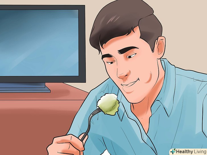 Вимикайте телевізор.можливо, ви переїдаєте не через стрес і негативні емоції, а просто тому, що відволікаєтеся під час їжі, не прислухаючись до сигналів, що подаються вашим організмом. Не відволікайтеся під час прийому їжі − вимкніть телевізор, комп'ютер, відкладіть в сторону книгу і зосередьтеся на їжі і своїх відчуттях. Дослідники виявили, що Перегляд телевізора під час їжі призводить до зміни раціону: зменшується частка овочів і фруктів і зростає кількість продуктів фастфуду, газованих напоїв і шкідливих солодощів.[23]
