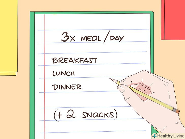 Складіть план харчування.намагаючись вести здоровий спосіб життя, перше, що потрібно буде змінити — ваш раціон харчування. Складіть собі новий план харчування-це допоможе вам дотримуватися здорового харчування весь тиждень.[6]- План харчування-це меню на кожен прийом їжі і кожен перекус протягом тижня.