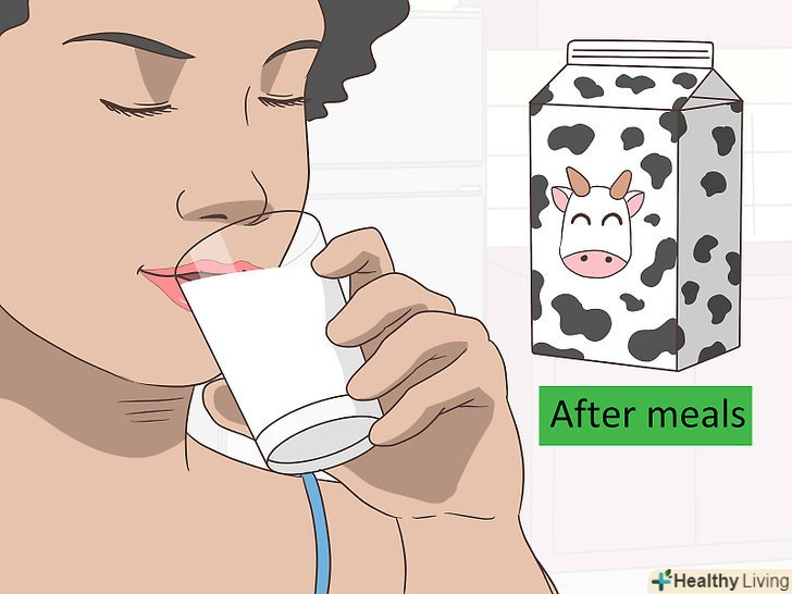 Випивайте склянку молока після їжі.кальцій не тільки знижує поглинання заліза, але і зводить нанівець ускладнення, що виникають через надмірну кількість заліза в організмі. На додаток до молока можна також з'їсти йогурт або сир твердих сортів.[7]- Якщо у вас непереносимість лактози, пийте мінеральну воду, насичену кальцієм, під час і після їжі.