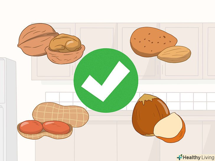 Перекушуйте горіхами і насінням.горіхи та насіння, включаючи волоські горіхи, мигдаль, арахіс та фундук, пригнічують поглинання заліза організмом. Якщо не хочете їсти горіхи сирими, додайте їх в запіканку або намажте на хліб горіхове масло.[10]- Хоча в кокосі присутні ті ж інгібітори, їх куди менше, і вони не так сильно впливають на здатність організму поглинати залізо.