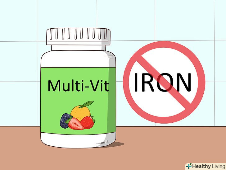 Відмовтеся від поживних добавок з залізом.якщо ви регулярно приймаєте мультивітамінні та інші харчові добавки, уважно прочитайте етикету на упаковці, щоб переконатися, що в них немає заліза. Залізо, що міститься в таких добавках, вкрай добре поглинається організмом.[11]- У продажу також часто можна зустріти продукти, збагачені залізом (на зразок хліба). Перевіряйте етикетку з харчовою цінністю обраного продукту і не купуйте продуктів, збагачених залізом.