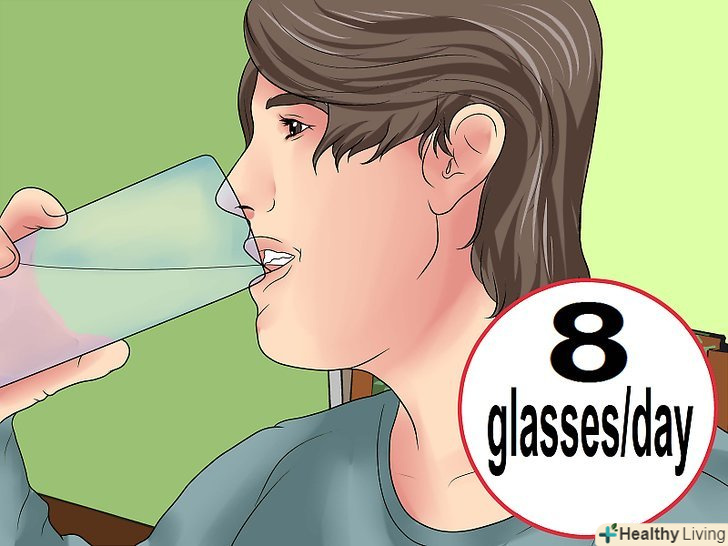 Пийте достатню кількість води.намагайтеся випивати денну норму рідини. Зазвичай рекомендується випивати вісім склянок або 2 літри води в день. Слід розуміти, що це лише загальна рекомендація, а вам може вимагатися трохи більше або менше рідини. Так можна не тільки схуднути, але і контролювати рівень голоду протягом дня.[6]- Вам може здатися, що ви голодні, насправді ж, організму не вистачає рідини. Якщо не вживати достатню кількість води, то зневоднення може стати причиною почуття голоду і людина почне їсти більше, ніж необхідно.[7]