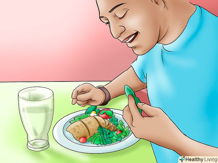 Міняйте кількість поглинаються калорій, це допоможе скинути вагу.Пробуйте найпростіші способи скорочення калорій.[25]- Їжте повільніше, щоб скоротити калорії. Ваш мозок тільки через двадцять хвилин усвідомлює, що організм наситився. Згідно з деякими дослідженнями, неспішне поглинання їжі веде до більш швидкого насичення.[26]