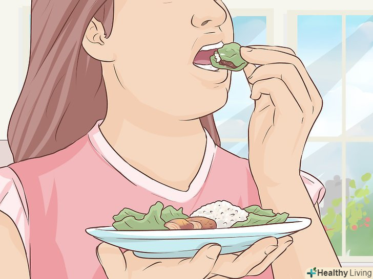 - Кожен прийом їжі повинен складатися з здорових страв. Їжте більше овочів (чим зеленіше, тим краще), різноманітні фрукти, продукти з цільних зерен (хліб або макарони) і білкову їжу, таку як риба, м'ясо птиці, квасоля і горіхи.[21]