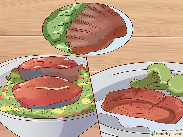 Оцініть, скільки м'яса ви їсте.ви можете знизити рівень холестерину, зменшивши споживання тваринних жирів. Намагайтеся вживати нежирне м'ясо, наприклад, м'ясо птиці і рибу. Деякі види риби набагато кращі, ніж м'ясо птиці:[6][7]- Тріска, тунець і палтус містять менше жирів і холестерину в порівнянні з птахом. Постарайтеся замінювати свинину, яловичину або курку рибою хоча б пару раз в тиждень.