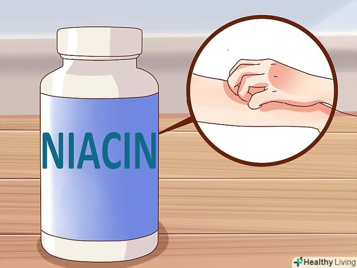 Дізнайтеся про ніацин.Ніацин-це вітамін B3, який пригнічує вироблення поганого холестерину, підвищуючи рівень хорошого холестерину, а також знижує рівень тригліцеридів.[15] Ніацин необхідно приймати у високих дозах-тільки тоді він буде давати ефект, тому обов'язково проконсультуйтеся з лікарем, оскільки ризик пошкодження печінки, проблем з шлунково-кишковим трактом і порушення переносимості глюкози великий.[16]- При прийомі ніацину можуть виникати відчуття жару, свербіж, почервоніння або відчуття поколювання під шкірою. Однак, з часом ці негативні відчуття повинні пройти.
