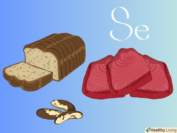 Їжте продукти, багаті селеном.селен – це метал, який відіграє значну роль у забезпеченні хорошого здоров'я мозку, зокрема, як антиоксидант. [7] було виявлено, що недостатній рівень селену призводить до погіршення пам'яті, поганого настрою і зниження когнітивної функції, в той час як підвищення рівня селену покращує здоров'я, ясність мислення і рівень енергії. [8] їжте продукти, багаті селеном, щоб споживати щонайменше 55 мікрограмів (мкг) на день, оскільки це корисно для мозку:[9]- Їжте цільнозерновий хліб - він містить 10 мкг селену в одному шматочку.