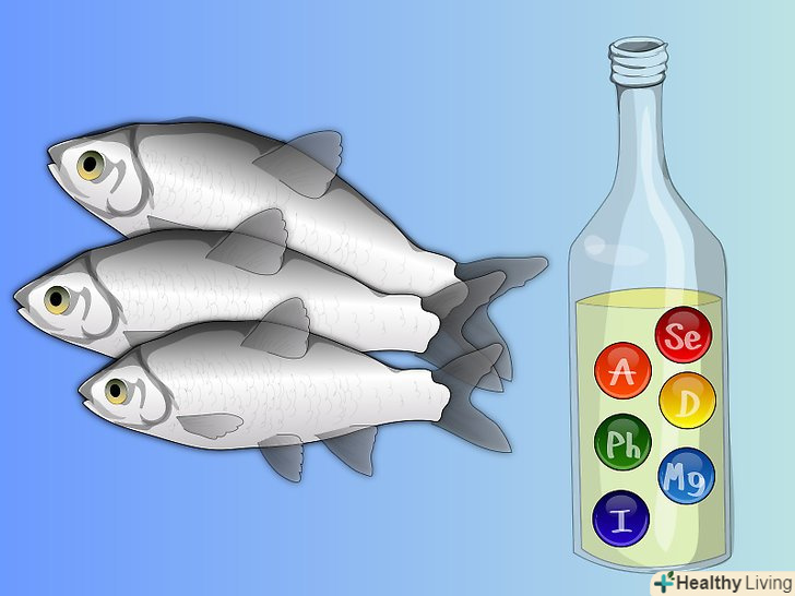 Їжте рибу і приймайте риб'ячий жир. риба містить селен, вітаміни A і D, фосфор, магній і йод (якщо Риба морська) [10] Риб'ячий жир - найбагатше джерело жир, необхідного для розвитку мозку у ненароджених дітей і немовлят. [11] З'їдайте близько 400 г риби в тиждень, в трьох порціях (кожна з них приблизно розміром з кулак). Риб'ячий жир можна придбати у вигляді харчової добавки, посилений ДГК. [12]- Спробуйте з'їсти 320 г рибного супу з 1 чайною ложкою васабі на цьому тижні.