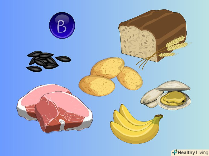 Їжте продукти, багаті вітаміном B. вітаміни групи В зберігають захисну оболонку нервів, а також відповідають за допомогу у виробництві хімічних речовин, які нерви використовують для комунікації. [13] вітаміни B6, B12 і фолієва кислота допоможуть вашим нейромедіаторам працювати ефективно, але не доведено, що добавки з вітамінами групи В безпосередньо покращують мислення (фолієва кислота, 400 мкг; B12, 800 мкг, and B6, 40 мг). Проте, було помічено, що розумова діяльність погіршується при низькому рівні вітаміну В, А дослідження про користь вітамінів групи В при лікуванні хвороби Альцгеймера. [14] до хороших харчових джерел вітаміну В відносяться: свинина, насіння соняшнику, збагачені зернові продукти, м'ясо (індичка, ягнятина і т.д.), морепродукти (мідії на пару, тунець, сардини і т. д.), збагачена борошно, нут, картопля, курка і банани. [15]- Спробуйте новоанглійський клем-чаудер.