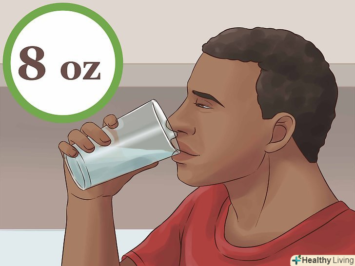 Випивайте 240 грамів води. може здатися, що ви зголодніли, але насправді це просто спрага![10] спробуйте пити воду або інший прозорий напій без цукру (на зразок охолодженого дієтичного чаю) незадовго до прийому їжі. Так вам буде вимагатися менше їжі для насичення.- Для запобігання симптомів зневоднення намагайтеся випивати 1,8 літра прозорих напоїв без цукру в день. Завжди носіть з собою пляшку води і робіть глотки протягом дня!