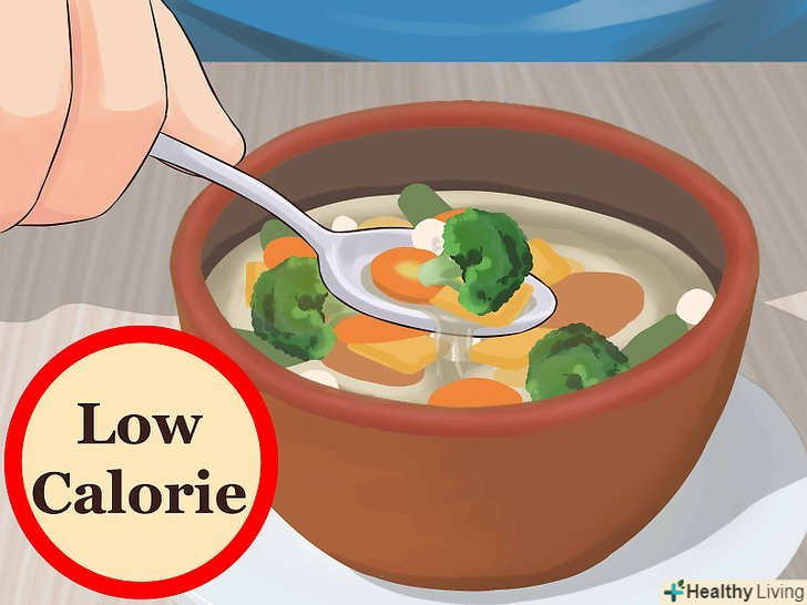 Починайте з низькокалорійних продуктів.перед основною стравою поласуйте некалорійною їжею на зразок овочів або овочевого супу. Це допоможе вам вгамувати голод і наповнити свій шлунок низькокалорійними продуктами, щоб контролювати розмір порції.[13]- Зберігайте в холодильнику чисті і нарізані сирі овочі. Поставте на стіл невеликі порції під час приготування їжі або сервірування столу.