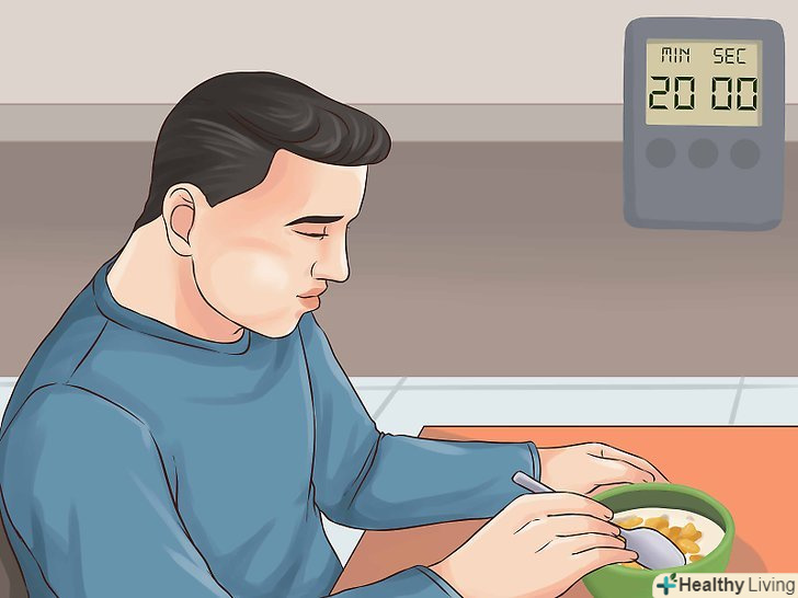 Засікайте час прийому їжі.час прийому їжі має становити не менше 20 хвилин. Саме стільки часу потрібно мозку, щоб передати сигнал про насичення і задоволення.[14] якщо ж вживати їжу швидше, то можна з'їсти значно більше необхідної порції, перш ніж відчути насичення.- Встановіть секундомір або таймер на 20 хвилин, щоб контролювати час прийому їжі.
