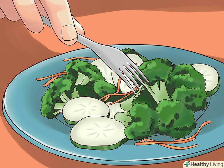 Вживайте в їжу більше овочів. Іноді складно дотримуватися невеликих порцій. Якщо ви зовсім не наїлися, то спробуйте доповнити прийом їжі овочами. Вони містять невелику кількість калорій і багато поживних речовин на зразок клітковини і вітамінів. Добавка овочів нікому не зашкодить.- Частина страви може становити салат. Він легкий і дозволяє випробувати задоволення від їжі, а також додаткове насичення.