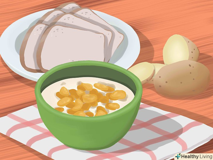 Скорочуйте порції злаків і крохмальних продуктів.багата вуглеводами їжа на зразок злаків і крохмальних продуктів може становити здорову частину раціону. При цьому в порівнянні з фруктами, овочами і пісним білком вони містять менше поживних речовин, але більше калорій.[4] важливо контролювати розміри порцій таких продуктів.- 1 скибочка хліба, 1 склянка каші або ½ склянки макаронних виробів, рису або ячменю вважаються однією порцією. У день слід вживати в їжу 2-3 порції злаків.[5]