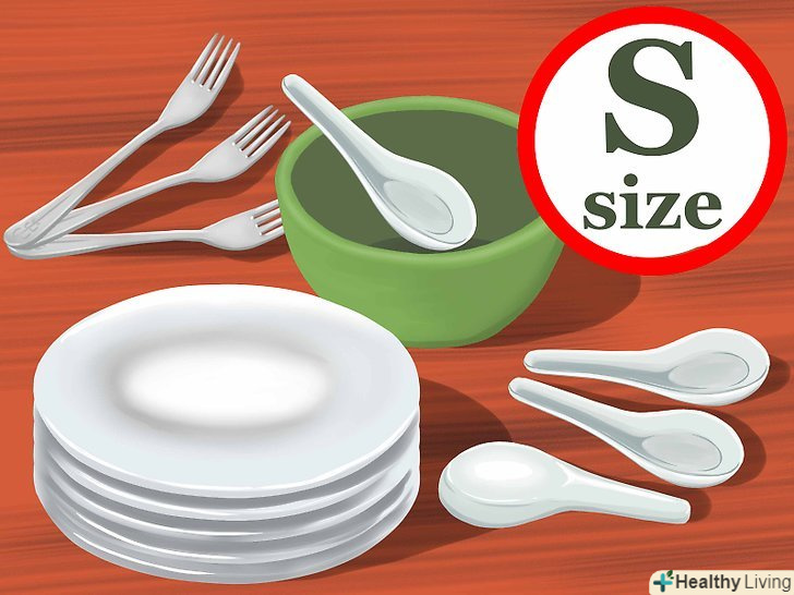 Купіть столові прилади невеликого розміру.багато досліджень продемонстрували, що чим більше тарілки і столові прилади, тим більше їжі споживає людина за один прийом їжі.[6] для вирішення проблеми можна купити тарілки і миски меншого розміру, а також використовувати Десертні ложки замість великих столових ложок.- Подавайте основне блюдо на тарілках для салату або закусок. Вони відмінно відповідають невеликим порціям.