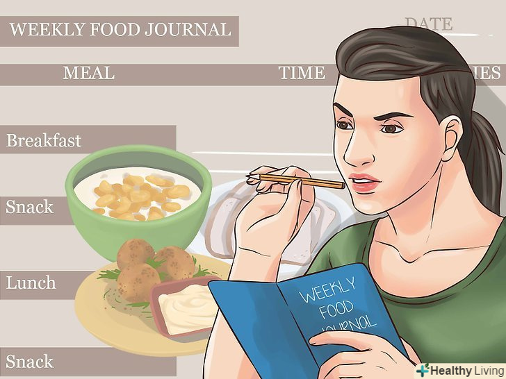 Почніть вести щоденник.записуйте кожен прийом їжі, щоб краще зрозуміти свої харчові звички. Можна вказувати конкретні продукти, розміри порцій і ваші успіхи в зміні своїх звичок.[7]- Також щоденник допоможе зрозуміти, коли ви починаєте відчувати голод. Ці відомості допоможуть вам заздалегідь планувати час для перекусів.