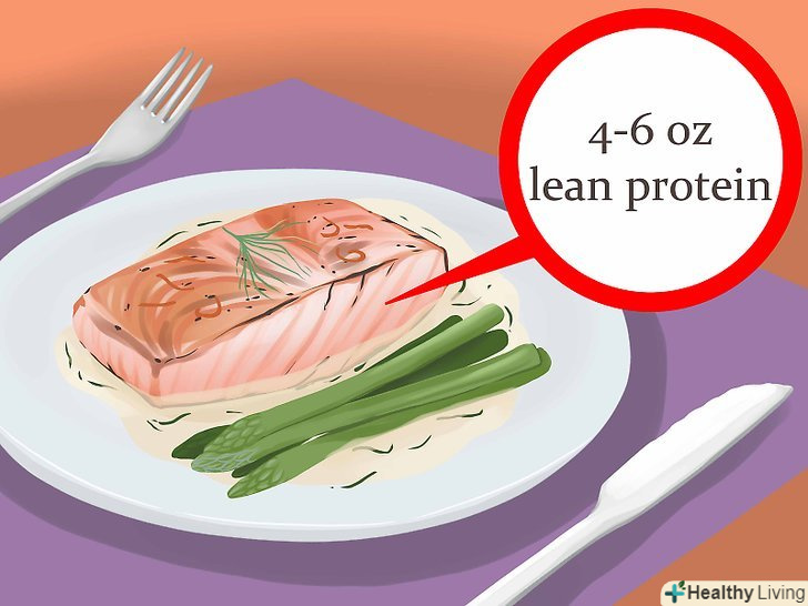 Міряйте порції.завжди міряйте страви за допомогою кухонних ваг і мірних склянок. Слід вживати в їжу 120-170 грамів пісного білка і хоча б 1-2 порції овочів або фруктів.- Підготуйте порцію і приберіть залишилися продукти, щоб не піддаватися спокусі взяти добавку.