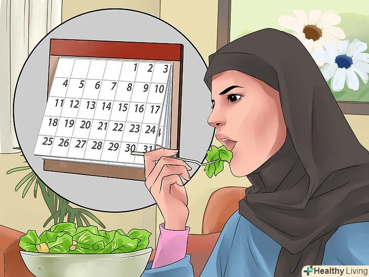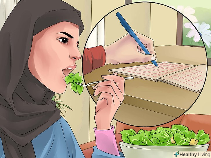 Ведіть харчовий щоденник.записуйте все, що ви з'їдаєте протягом дня. Крім того, відстежуйте свою харчову поведінку при переїданні. Це допоможе вам бути більш уважним до своєї харчової поведінки. Завдяки цьому ви зможете змінити свої харчові звички.[5]- Крім того, крім згадки про кількість з'їденої їжі, ви можете включати інформацію про ваш настрій, почуття та емоції. Записуйте, чи їли ви поодинці або в компанії друзів, і якими видами діяльності ви займалися крім прийому їжі. Також записуйте інформацію про час і місце прийому їжі.[6] завдяки цьому ви будете мати повне уявлення про проблеми харчової поведінки.