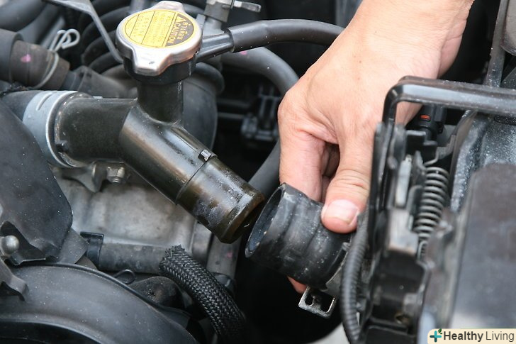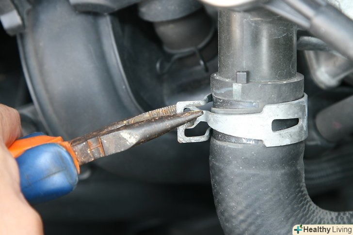 Вхопіться за шланг і почніть знімати його з патрубка, до якого він приєднаний.- Зніміть затискачі з протікає шланга радіатора.