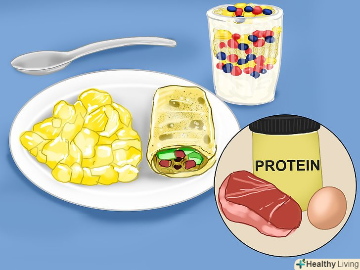 Віддайте перевагу висококалорійним продуктам з великим вмістом білка.ідеальним вибором є м'ясо, сири і поживні цільнозернові вуглеводи. Ви почнете набирати вагу, просто споживаючи всього багато, але не слід забувати і про дефіцит поживних речовин, що є однією з головних складових недовага.[3]- Приклад страв на сніданок: яєчня з сиром, йогурт з фруктами і мюслями, а також буріто на сніданок.