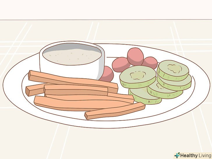Полегшіть собі доступ до здорової і корисної їжі.багато людей не можуть змінити свої звички харчування через те, що інші види їжі занадто важкодоступні. При зміні свого раціону не пошкодуйте часу і з'ясуйте, якими шляхами можна максимально полегшити собі доступ до здорової їжі. Ось лише деякі способи:- Купуйте невеликі порції нарізаних овочів або заздалегідь готуйте достатню кількість овочів для перекусів протягом декількох днів і кладіть їх в холодильник, щоб вони завжди були під рукою. Краще відразу приготувати велику кількість овочів про запас, ніж мати відмовку» я не хочу готувати", коли вам захочеться перекусити. Для перекусу добре підходять такі овочі: селера, морква, солодкий горошок, редиска, пророщена соя тощо.