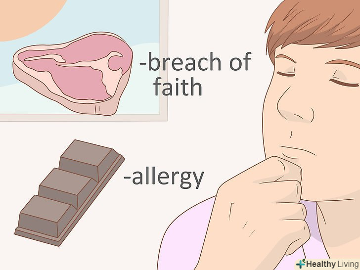 Подумайте про свої погляди і здоров'я.якщо вживання певної їжі суперечить вашій вірі або переконанням або негативно впливає на ваше самопочуття, це має більш далекосяжні наслідки, ніж простий вплив на вагу тіла або здоров'я в майбутньому.- Якщо вживання певної їжі суперечить вашим релігійним переконанням, поговоріть зі священиком (пастором, муллою, рабином) і обговоріть можливі рішення проблеми. Можливо, він дасть вам корисні поради, адже подібні ситуації зустрічаються досить часто.