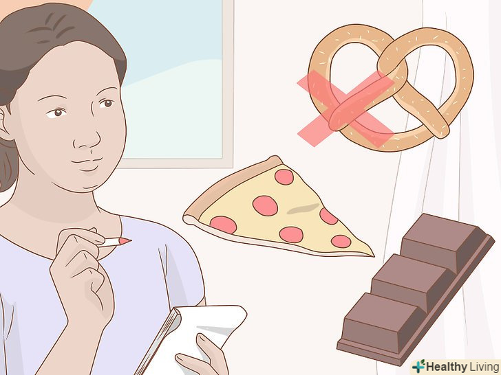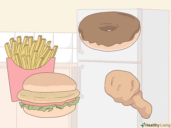 Визначте приваблюють вас види нездорової їжі.З'ясуйте, яку їжу ви не хочете або не повинні їсти з яких-небудь міркувань (дієтичним, з метою збереження здоров'я, релігійним і так далі), але до сих пір не відмовилися від неї. Подумайте, чому дана їжа приваблює вас: можливо, у неї особливий смак або інші властивості, яких не вистачає іншим продуктам у вашому раціоні? Ось деякі поширені варіанти: [2]- Регулярне вживання страв фаст-фуду, таких як картопля фрі, бургери, хот-доги, смажені страви тощо.