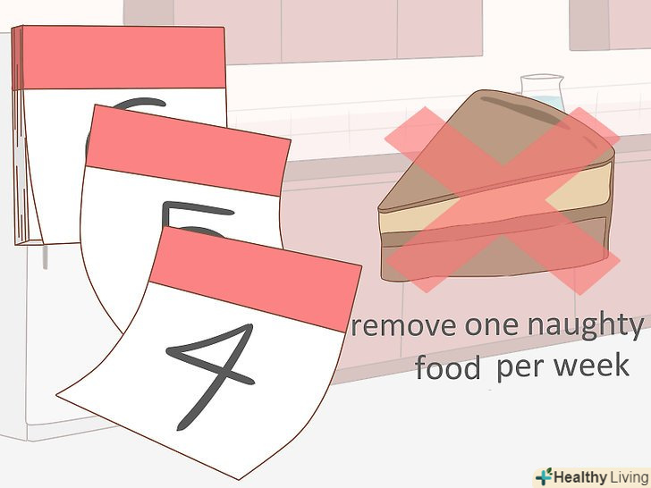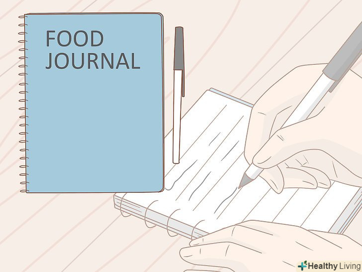 Складіть план.Подумайте, які види їжі ви хотіли б виключити зі свого раціону. Щоденник харчування допоможе вам визначити, що саме і в яких кількостях ви їсте і як ви себе почуваєте (емоційно і фізично) після цього. Ви можете відкрити для себе багато нового. Та їжа, від якої ви хочете відмовитися перш за все, може виявитися вашою улюбленою, або ви можете сприймати її як бажане ласощі, незважаючи на шкоду для здоров'я. Почніть з одного виду їжі, який ви хотіли б виключити зі свого раціону, і постарайтеся не їсти її протягом тижня. Не замінюйте її іншою їжею і не їжте більше інших видів нездорової їжі в спробах компенсувати втрату. Замість цього спробуйте випити склянку води. Звичайно, це не те ж саме, але таким чином ви наповніть свій шлунок і наблизитеся до своєї мети — здорового харчування.[5]- Спробуйте визначити, яка їжа вибиває вас з колії. Наприклад, кофеїн і цукор нерідко негативно діють на чутливі натури.