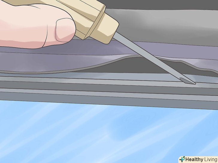 Застосовуйте смужку стрічки двостороннього спіненого поліуретану, такого як 3M VHB ("вельми хороша зв'язок") (підходить для будь-яких нерівностей) переважно чорного кольору, оскільки в цьому випадку ультрафіолетове випромінювання не зруйнує за короткий термін зовнішнє з'єднання, що примикає до скла з краєм, відповідним зверху до точки, яку ви визначили раніше.